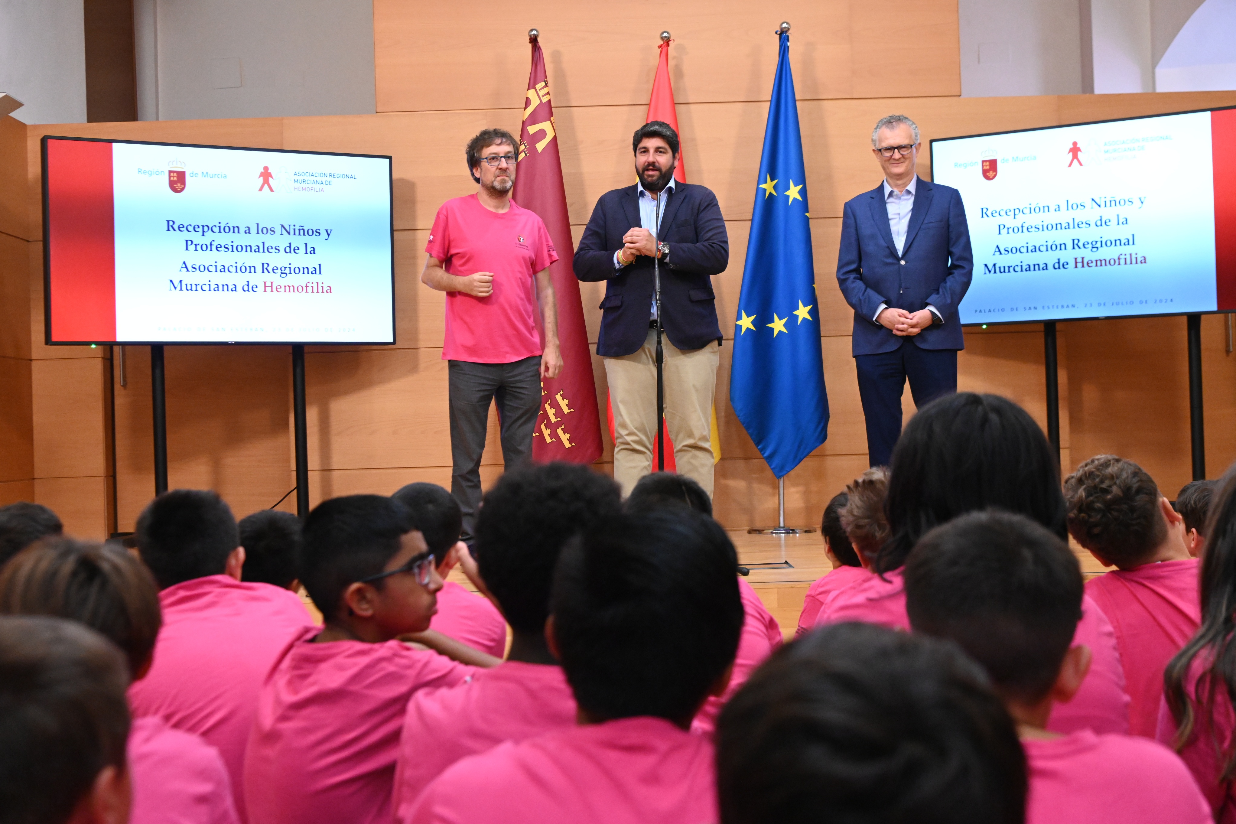 El presidente del Gobierno de la Región de Murcia, Fernando López Miras, recibió hoy en el Palacio de San Esteban a 50 niños afectados de hemofilia que están participando del 14 al 25 de julio en las XXXV Jornadas de Formación sobre esta enfermedad, desarrolladas en el Centro de Día y Formación Permanente de La Charca (Totana). Este campamento reúne a afectados de hemofilia que proceden de 13 provincias, y que cuentan con el apoyo permanente de un equipo de 18 profesionales que despliega actividades educativas, deportivas y lúdicas.