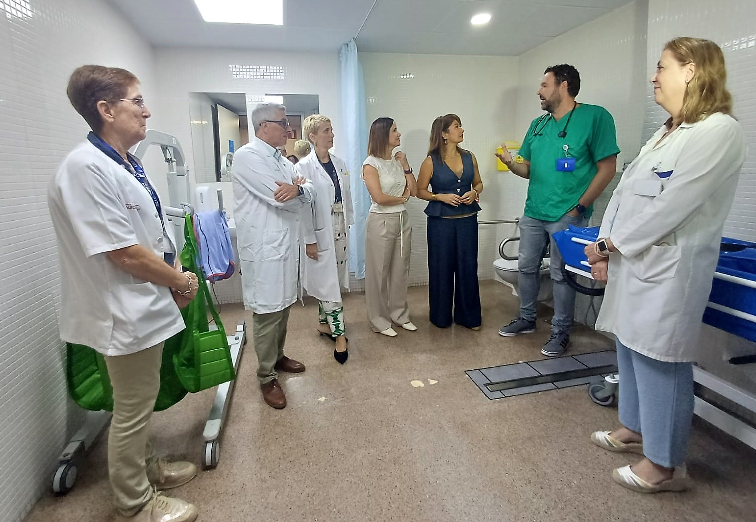 La gerente del SMS, Isabel Ayala (4d), visitó hoy el nuevo cambiador adaptado instalado en el hospital Santa Lucía ...