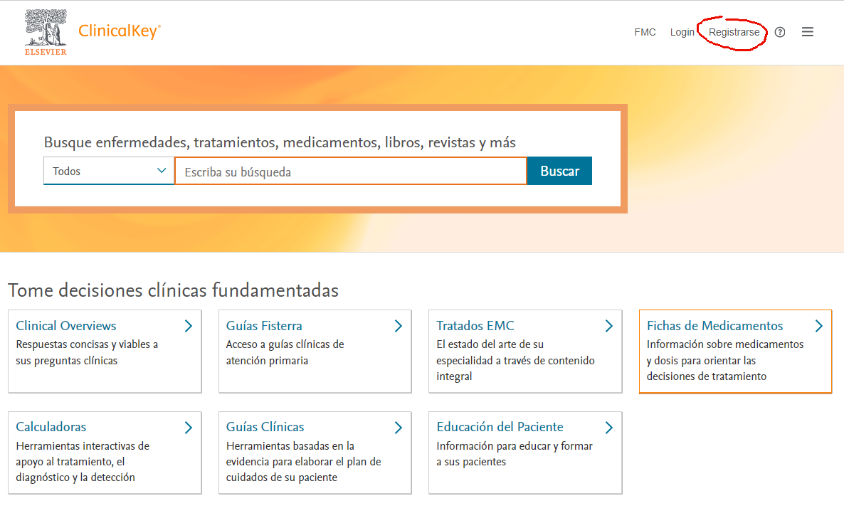 Desde la Intranet, acceda a ClinicalKey desde la Intranet, y pinche sobre el enlace Registrarse y cumplimente el formulario. Debe poner un correo corporativo (@carm.es)