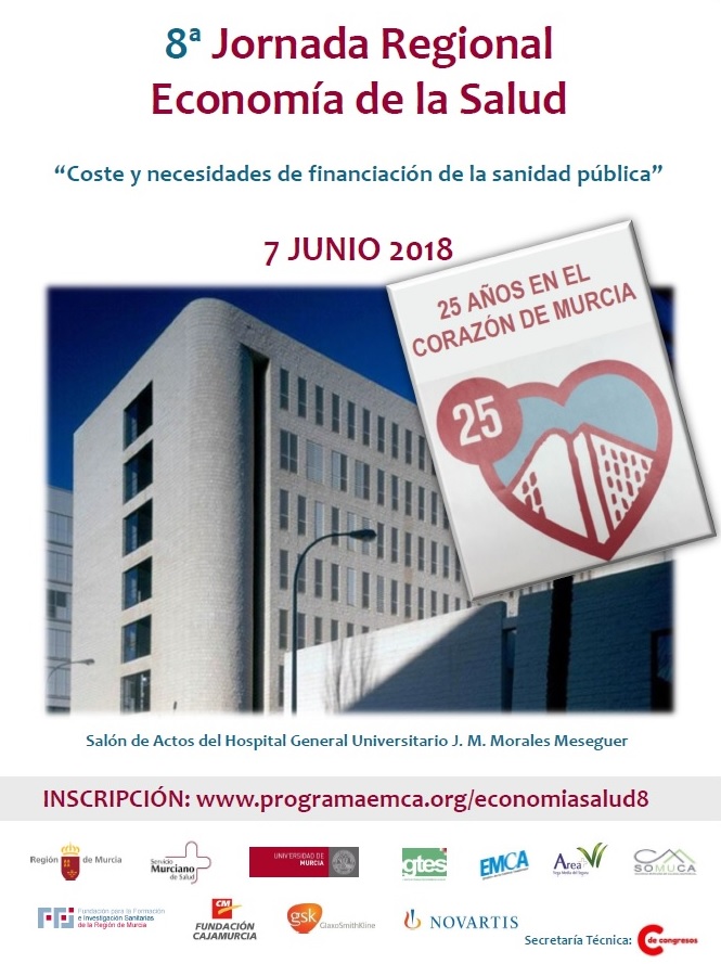 El 7 de Junio de 2018 se ha celebrado una nueva edición, la octava, de la JORNADA REGIONAL de ECONOMÍA DE LA SALUD. La Jornada se desarrolló en el Hospital General Universitario JM Morales Meseguer sumándonos a la celebración de sus "25 años en el corazón de Murcia".