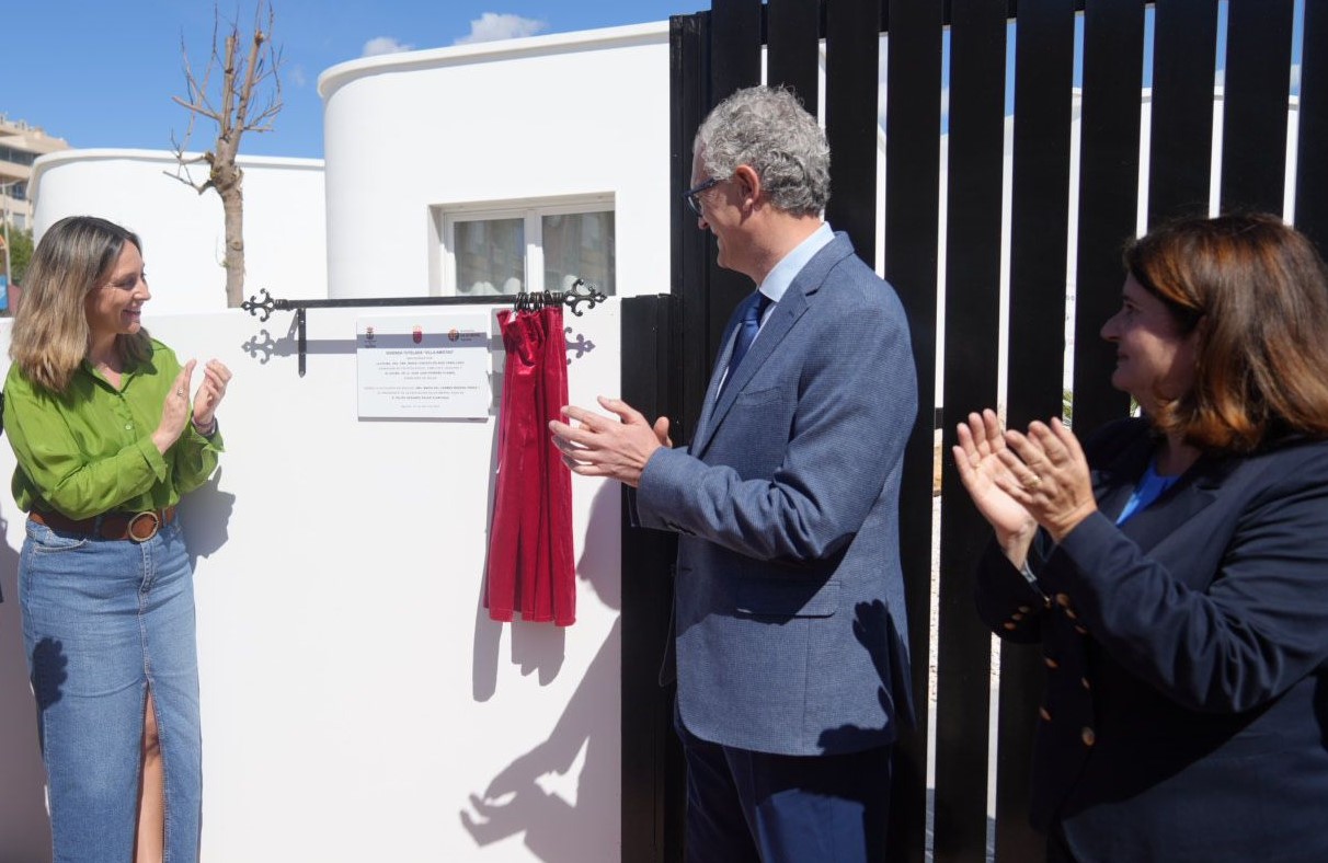 La consejera de Política Social, Conchita Ruiz, y el consejero de Salud, Juan José Pedreño, descubren la placa de este recurso residencial que destaca por su original diseño y la privacidad de sus estancias