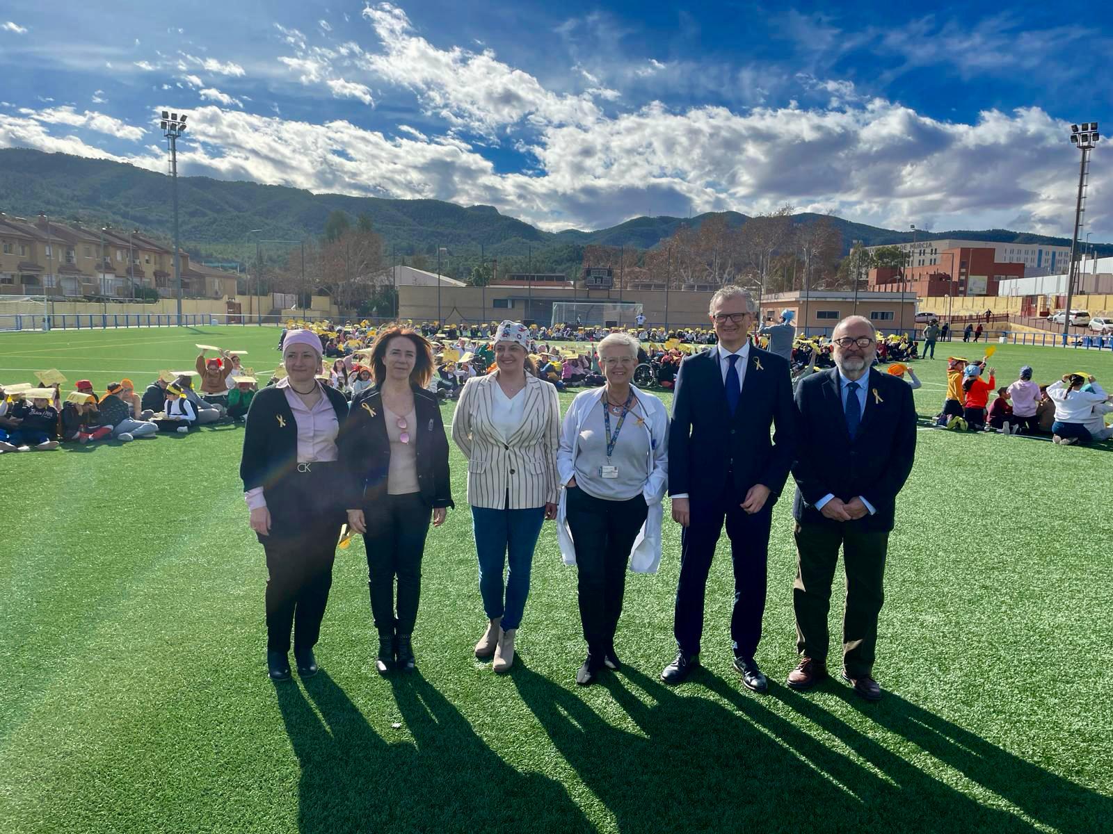 Cerca de 600 escolares de la pedanía murciana de El Palmar acudieron hoy a un encuentro con motivo del Día Internacional del Cáncer Infantil, que se celebra el 15 de febrero, y a los que acompañó el consejero de Salud, Juan José Pedreño. El acto tuvo lugar en el polideportivo de la pedanía, donde uno de los escolares leyó el manifiesto.