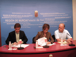 La consejera de Sanidad, María Teresa Herranz, en calidad de presidenta del Servicio Murciano de Salud, y el presidente de la Federación de Fútbol de la Región de Murcia, José Miguel Monje, han firmado hoy un convenio por el cual el Servicio Murciano de Salud se compromete a prestar la primera asistencia sanitaria de urgencias a los futbolistas inscritos en competiciones oficiales, para lo cual el SMS utilizará los medios propios de que disponga en sus Áreas y Zonas Básicas de Salud. Para recibir esta asistencia será requisito imprescindible que los deportistas estén afiliados a la Federación de Fútbol de la Región y que sean beneficiarios de la Mutualidad de Previsión Social de Futbolistas Españoles.