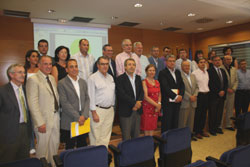 El consejero de Agricultura y Agua, Antonio Cerdá, la consejera de Sanidad y Consumo, María Ángeles Palacios, y el presidente de CROEM, Miguel del Toro, junto con representantes de organizaciones productoras y distribuidoras de bolsas de un solo uso, ayuntamientos y organizaciones de consumidores, tras la firma del convenio marco para el desarrollo de actuaciones encaminadas a la reducción de bolsas de un solo uso.