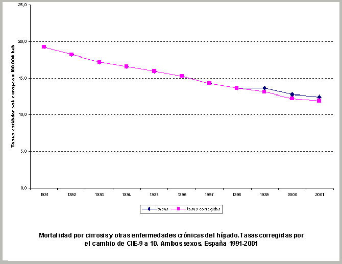 Mortalidad por cirrosis y otras enfermedades crónicas del hígado. Tasas corregidas por el cambio de CIE-9 a 10. Ambos sexos. España 1991-2001.