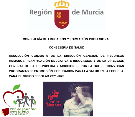 Resolución Conjunta de la Dirección General de Recursos Humanos, Planificación Educativa e Innovación y de la Dirección General de Salud Pública y Adicciones, por la que se convocan programas de Promoción y Educación para la Salud en la Escuela, para el curso escolar 2025-2026.