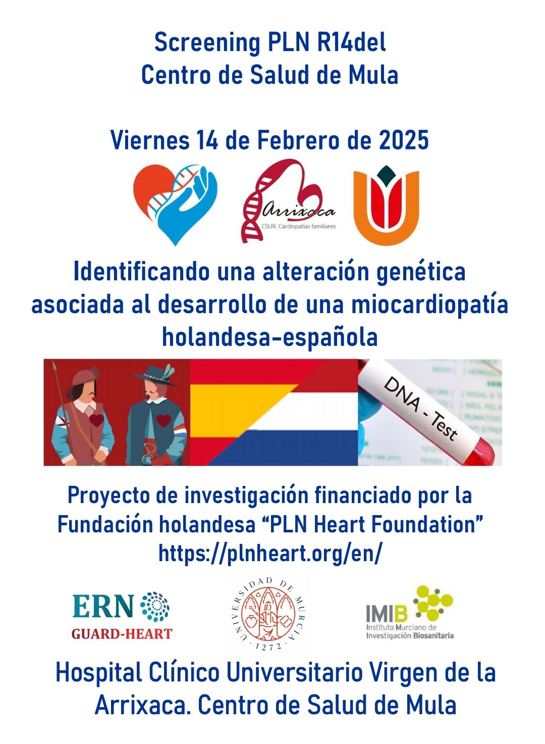 El próximo viernes 14 de febrero, estaremos en el Centro de Salud de Mula realizando un screening de una mutación holandesa y española, que causa una miocardiopatia arritmogenica, con un proyecto financiado por la Fundación holandesa "PLN Heart Foundation".