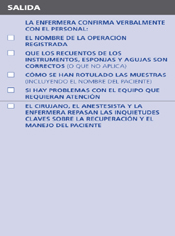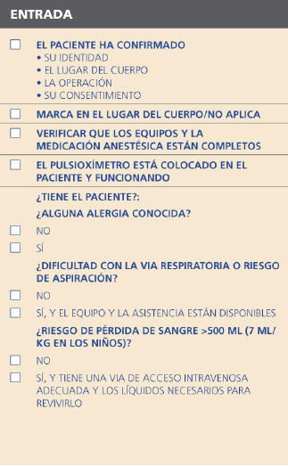 En la entrada del quirófano antes de la inducción de la anestesia, el coordinador del listado repasará verbalmente con el paciente (cuando sea posible) que se ha confirmado su identidad, la localización de la cirugía y el procedimiento a realizar y también que se ha obtenido el consentimiento informado para la intervención.
