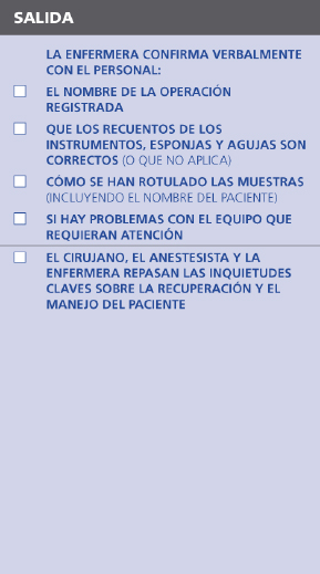 De este modo el coordinador confirmará visualmente que el lugar de la intervención ha sido marcado si procede y repasará verbalmente con el anestesista el riesgo de hemorragia, la posible dificultad de la vía aérea y las alergias, así como si se ha completado o no la revisión del total de los controles de seguridad de la anestesia.
