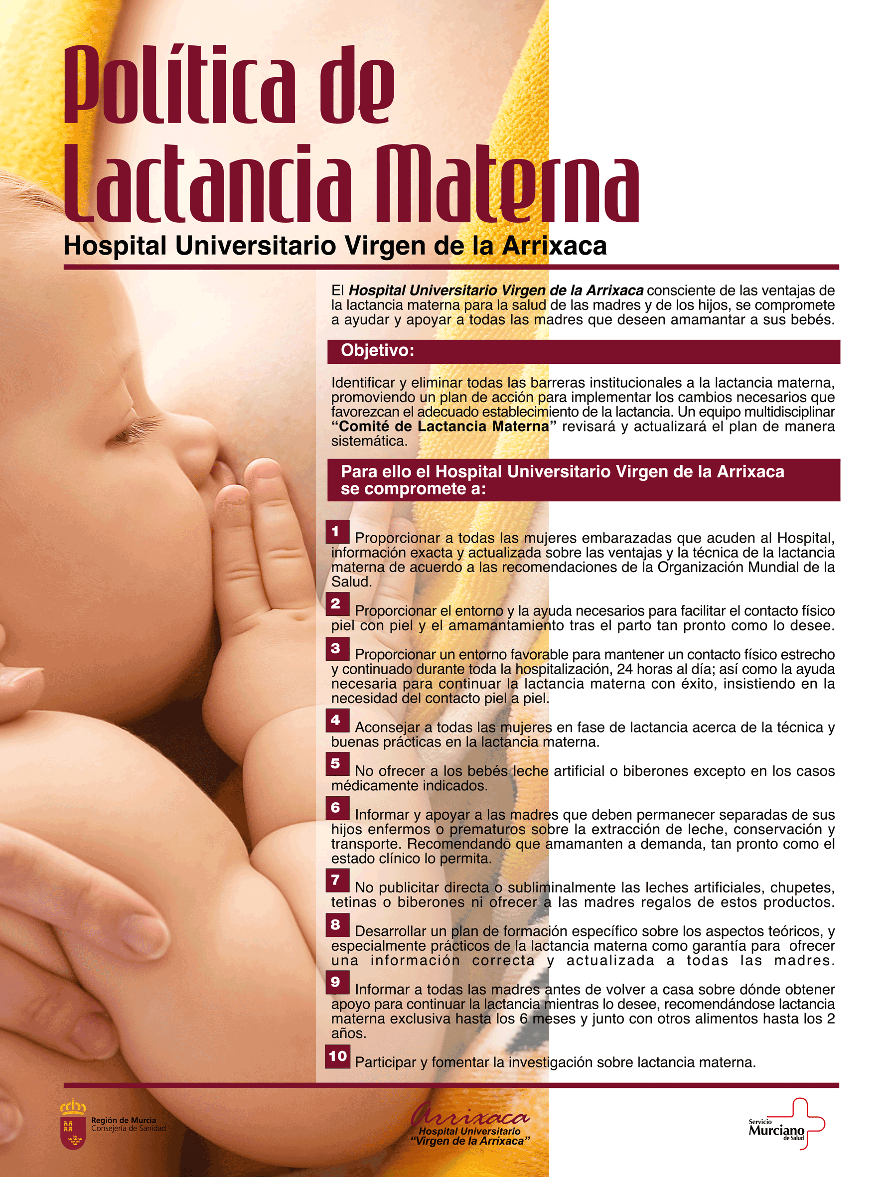 Un documento de consenso(4) del Comité de Lactancia Materna del Hospital Universitario Virgen de la Arrixaca (Murcia) señala que, dentro de la Política de LM que se lleva en dicho centro, y consciente de la importancia de la LM para la salud de madre y bebé, se compromete a apoyar a todas las madres que deseen amamantar a sus hijos. El objetivo de dicha política es identificar y eliminar todas las barreras institucionales a la LM, promoviendo un plan de acción para implementar los cambios necesarios.