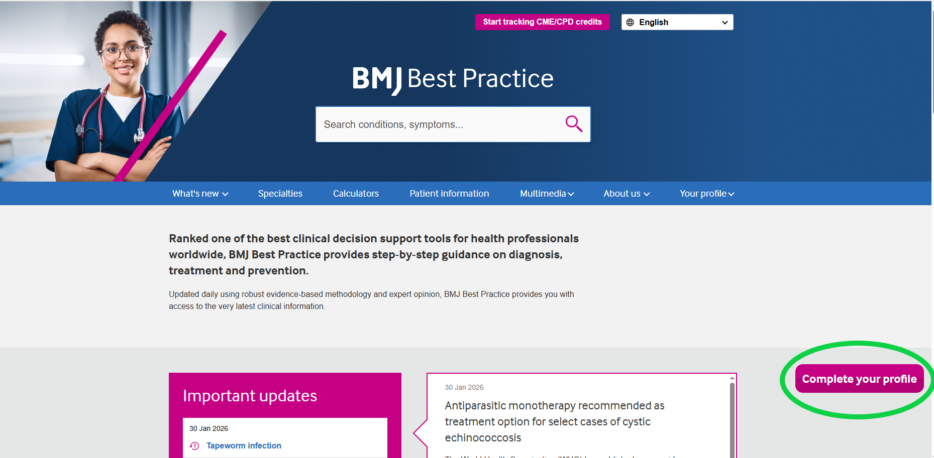 Una vez creado su perfil, vaya a la App store o Google Play, busque BMJ Best Practice, e instálela en su dispositivo.