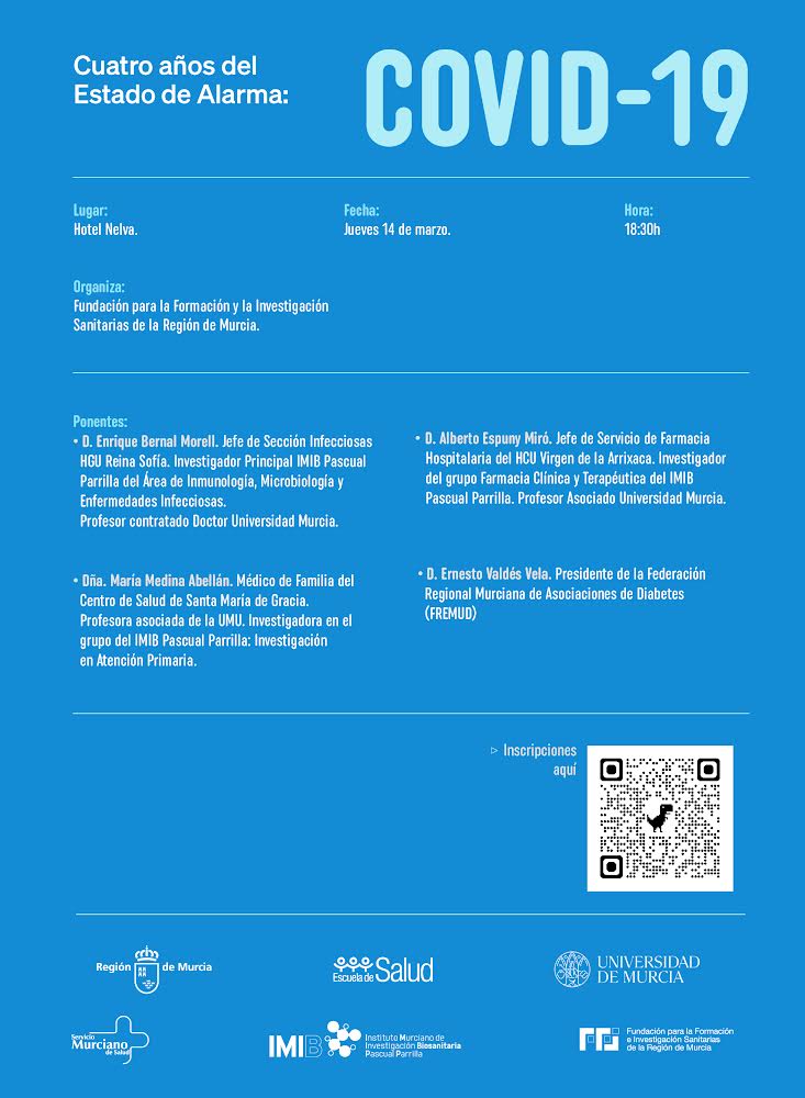 La Fundación para la Formación e Investigación Sanitaria de la Región de Murcia organiza el próximo jueves 14 de marzo a las 18:30 horas, en las instalaciones del hotel Nelva el encuentro Cuatro años del estado de alama. COVID-19, pasar página tomando nota, en el que participarán los profesionales D. Enrique Bernal Morell, D. Alberto Espuny Miró, Dña. María Medina Abellán y D. Ernesto Valdés Vela.