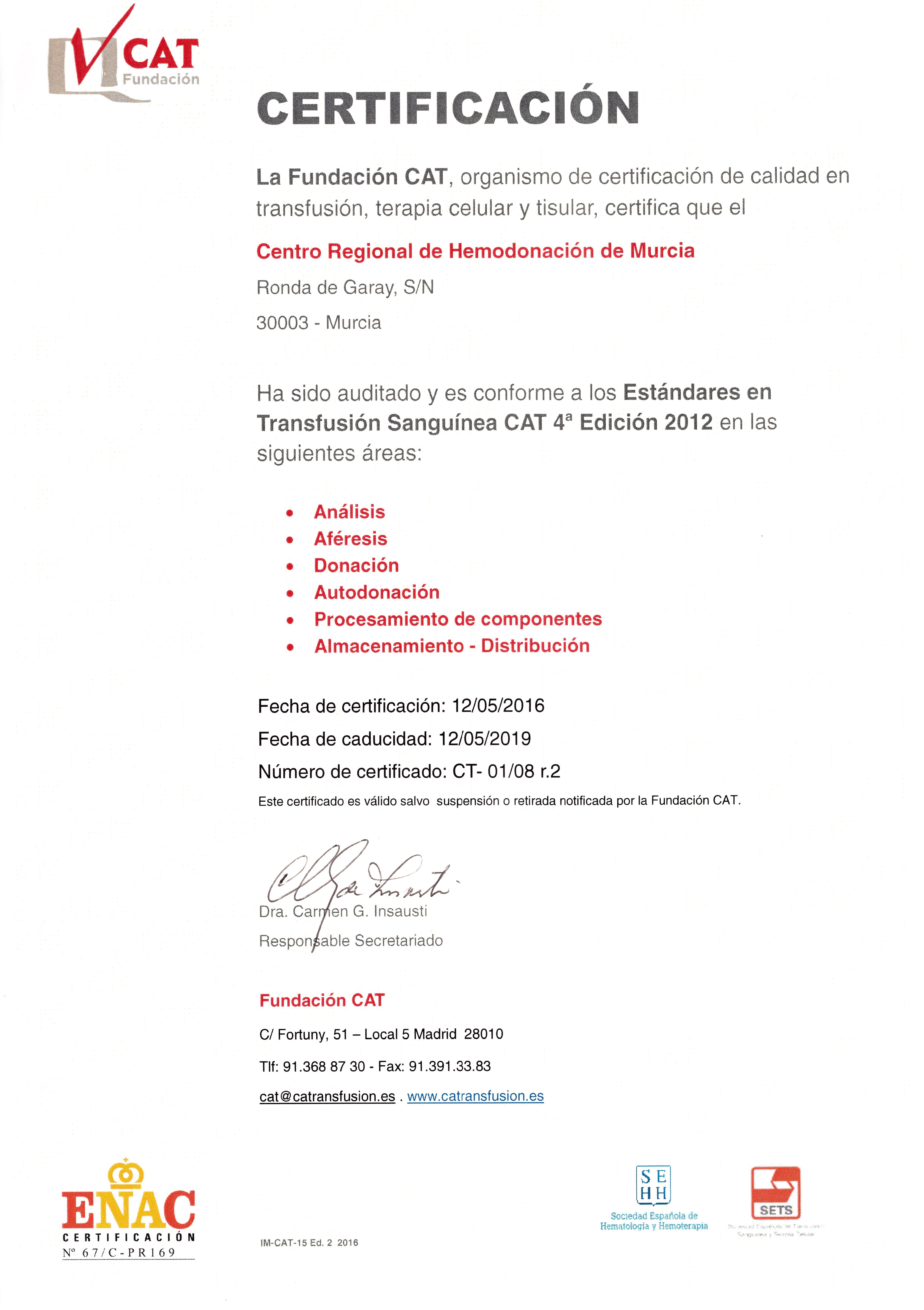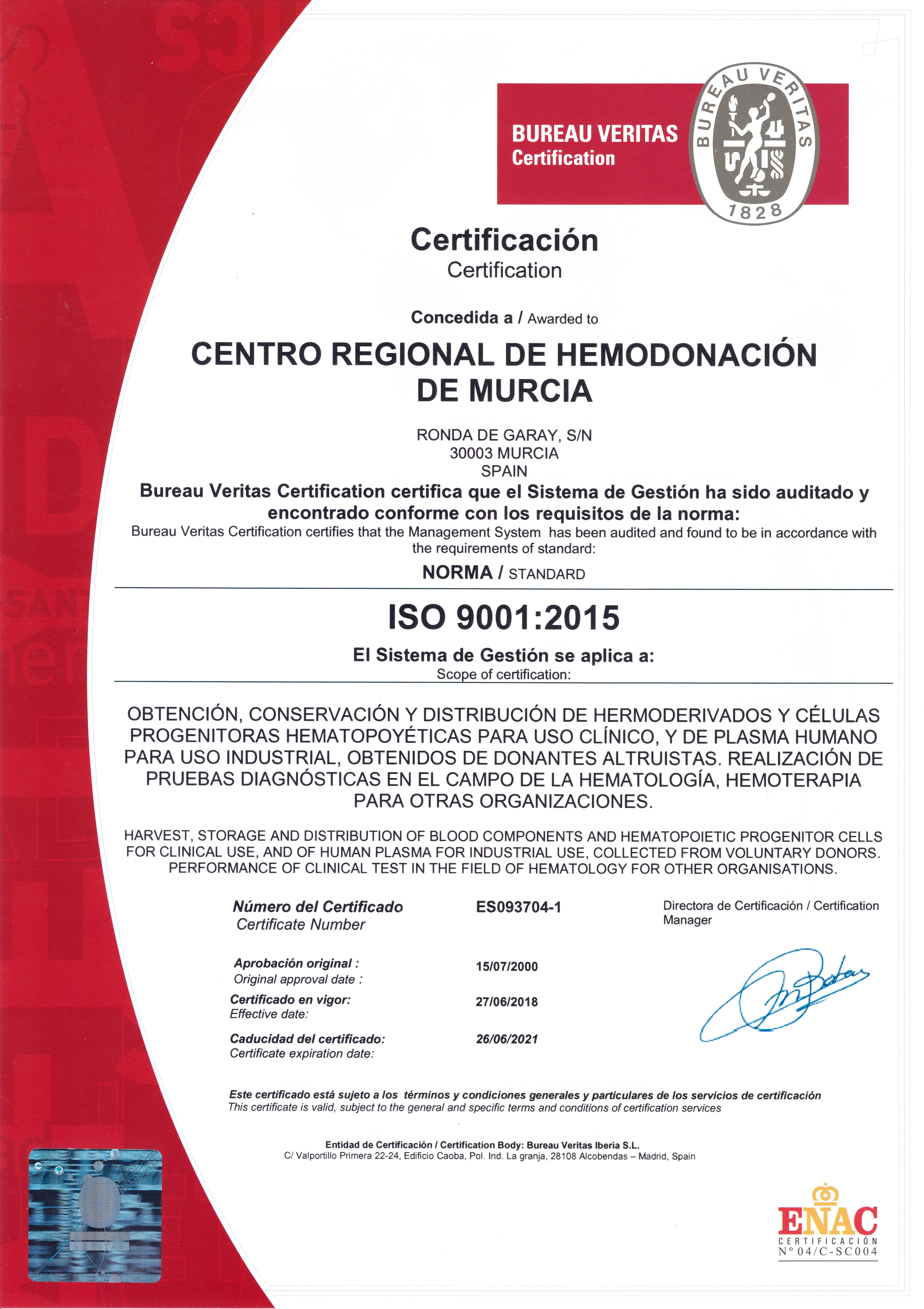 El Centro Regional de Hemodonación de Murcia (CRH), cuenta con una política en materia de calidad que viene definida por la especial estrategia y destino de los productos y servicios que configuran sus actividades. Para su establecimiento se han tenido en cuenta tres conceptos básicos que se complementan entre sí: La prestación de un servicio de alta calidad en un tiempo adecuado, conseguir la satisfacción de nuestros usuarios , y alcanzar los objetivos asistenciales y científicos propios del Centro Regional de Hemodonación.
