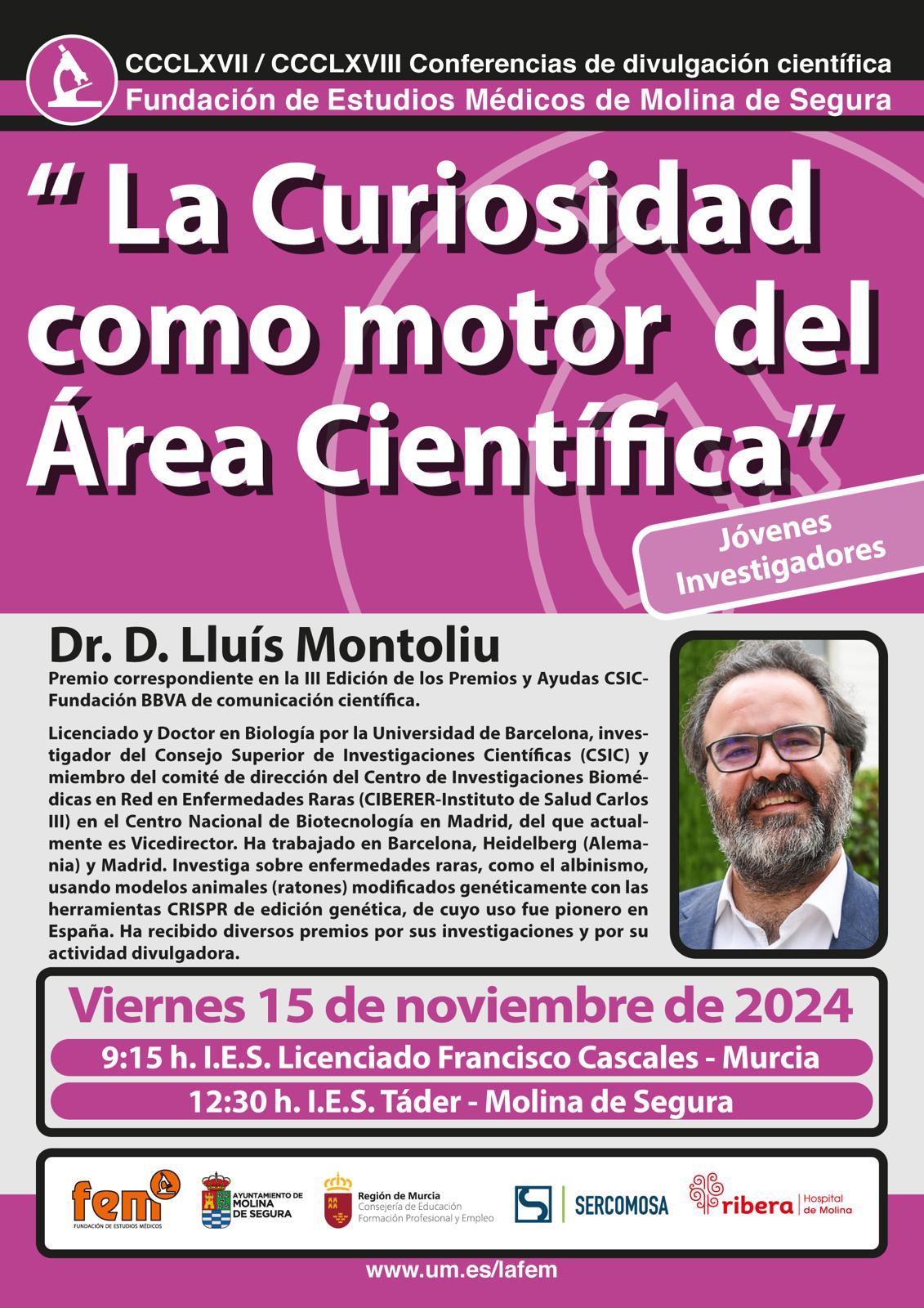 El Dr. Lluis Montolui impartirá una charla sobre "La Curiosidad como motor del Area Científica", el viernes 15 de Noviembre en Murcia, el Dr. Montolui es un prestigioso científico galardonado con numerosos premios por sus investigaciones y ha sido el pionero en España en el uso de la tecnologia CRISPR de edición genética, para la investigación de enfermedades raras.