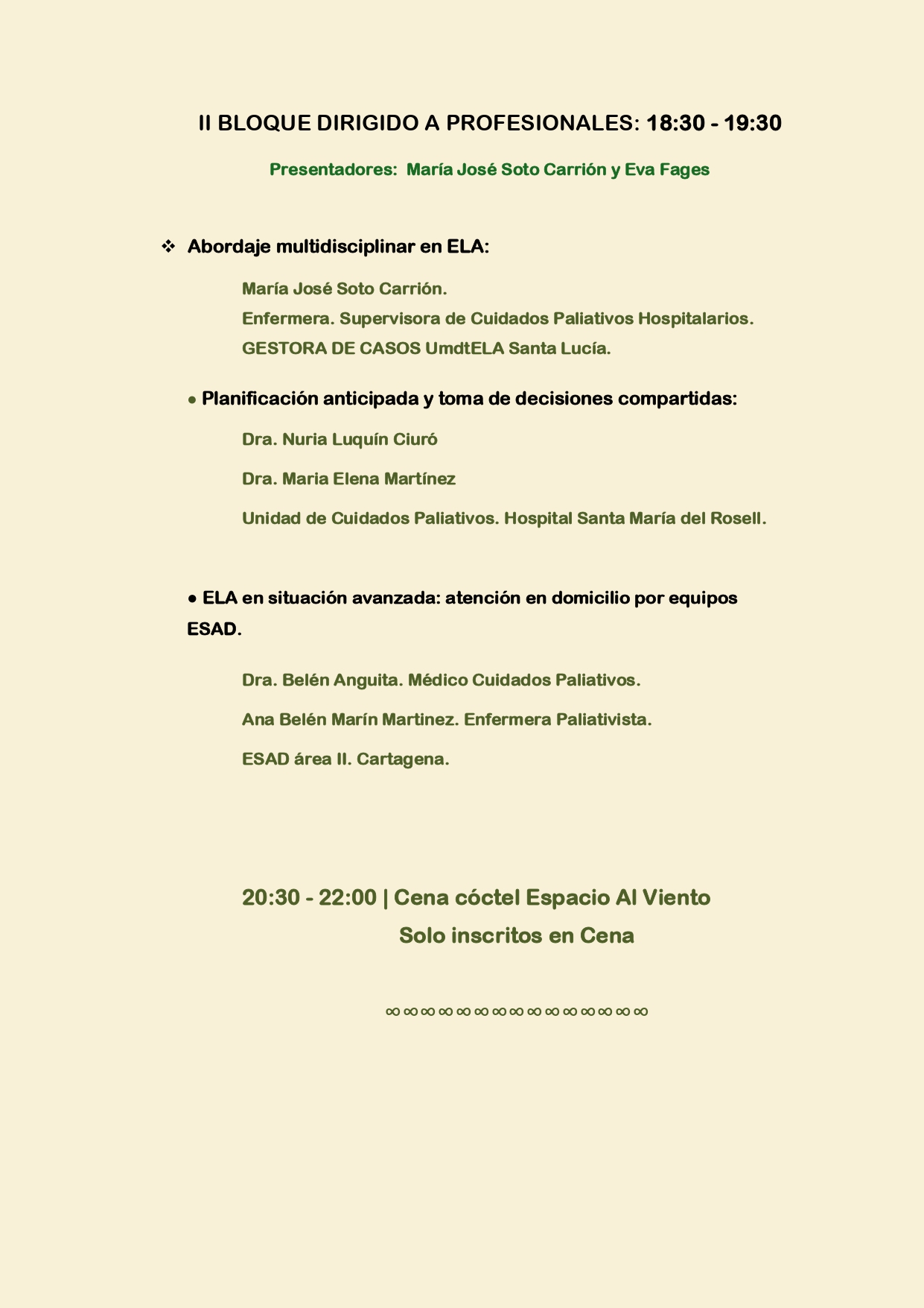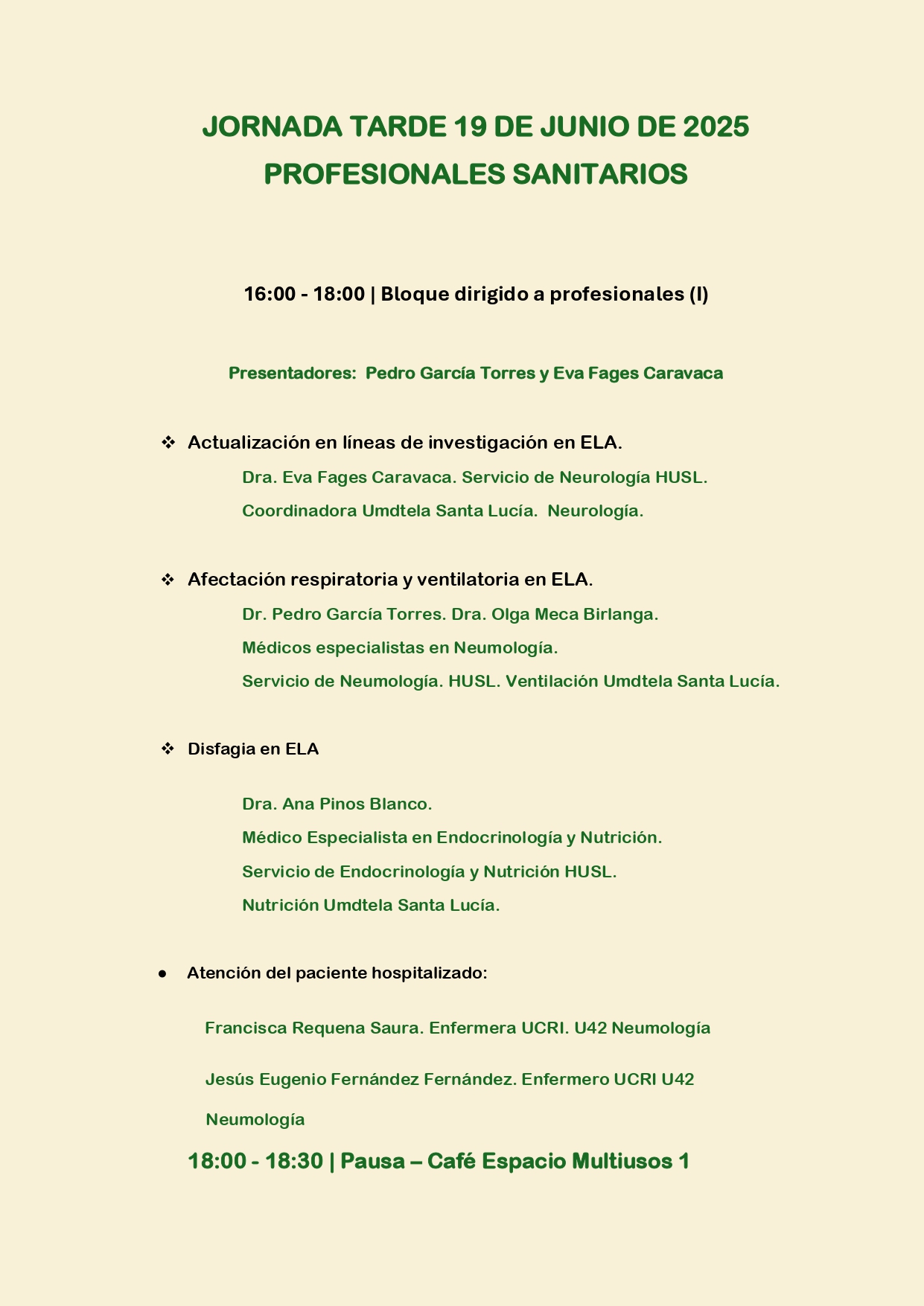 La primera sesión, el día 19 por la tarde, estará dirigida a profesionales sanitarios, con ponencias centradas en las últimas investigaciones, complicaciones respiratorias, nutricionales y la atención hospitalaria del paciente con ELA. Destaca la participación del equipo de Cuidados Paliativos del Área II, que aportará su enfoque holístico sobre la enfermedad, incluyendo aspectos como la planificación anticipada y la atención domiciliaria en fases avanzadas.