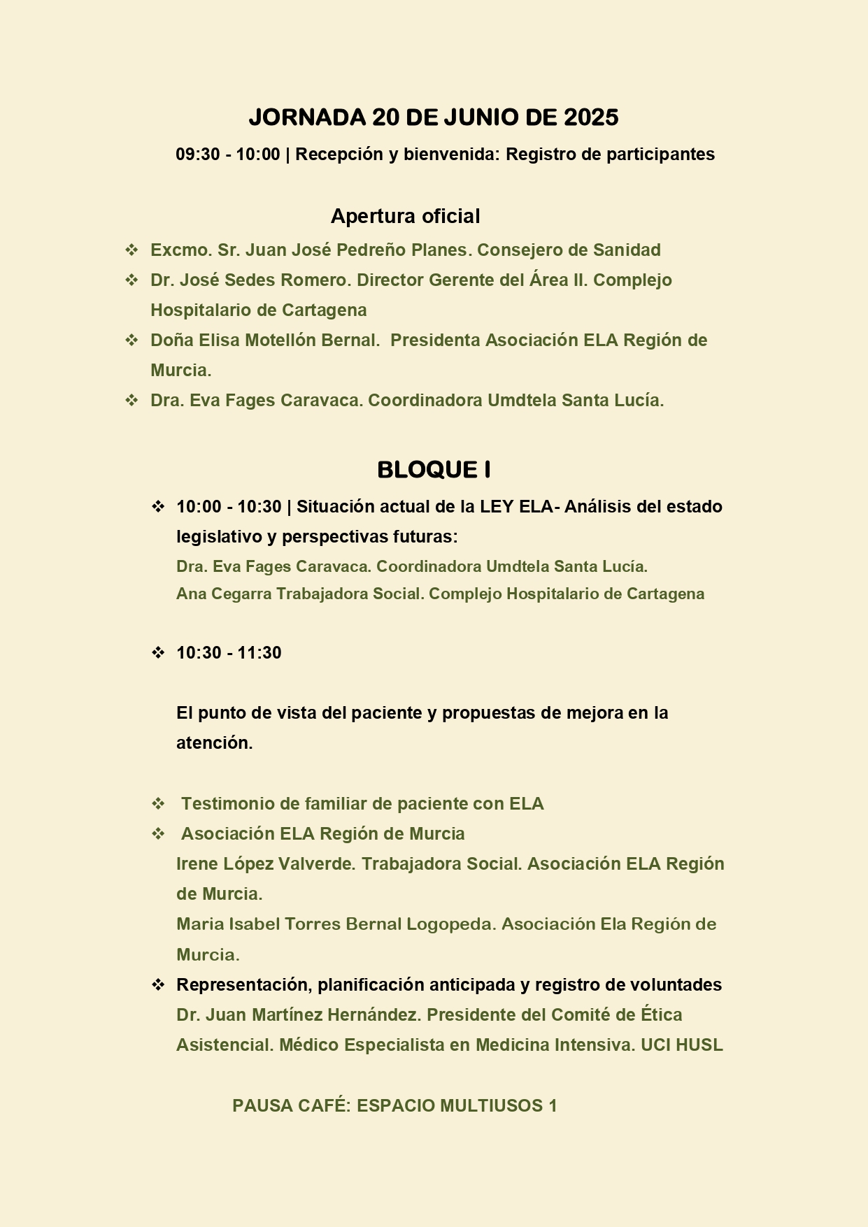 El 20 de junio será una jornada abierta a pacientes, familiares y cuidadores, tras la sesión inaugural presidida por el Consejero de Sanidad. Durante la mañana se abordarán temas clave como la situación legislativa de la Ley ELA, testimonios en primera persona y los aspectos éticos del proceso asistencial.