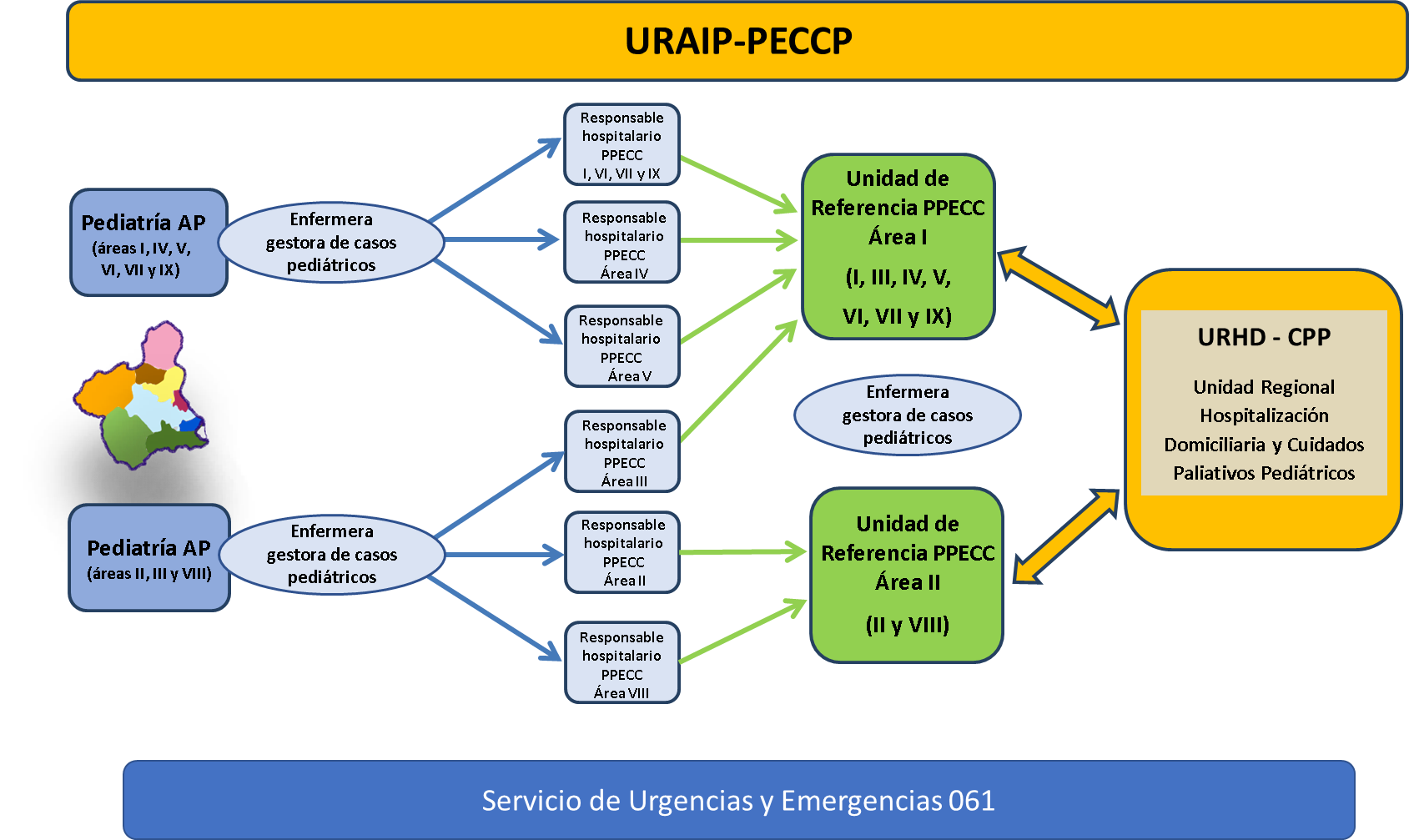 La URAIP-PECCP (Unidad Regional de Atención Integral del Paciente con Enfermedad Crónica Compleja y Cuidados Paliativos) engloba y coordina los diferentes niveles asistenciales, que son: