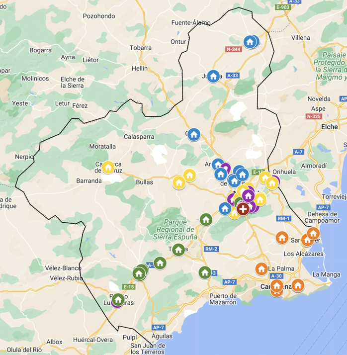 - Ruta naranja: atiende a los niños con domicilios ubicados en el área II Cartagena y área VIII Mar Menor